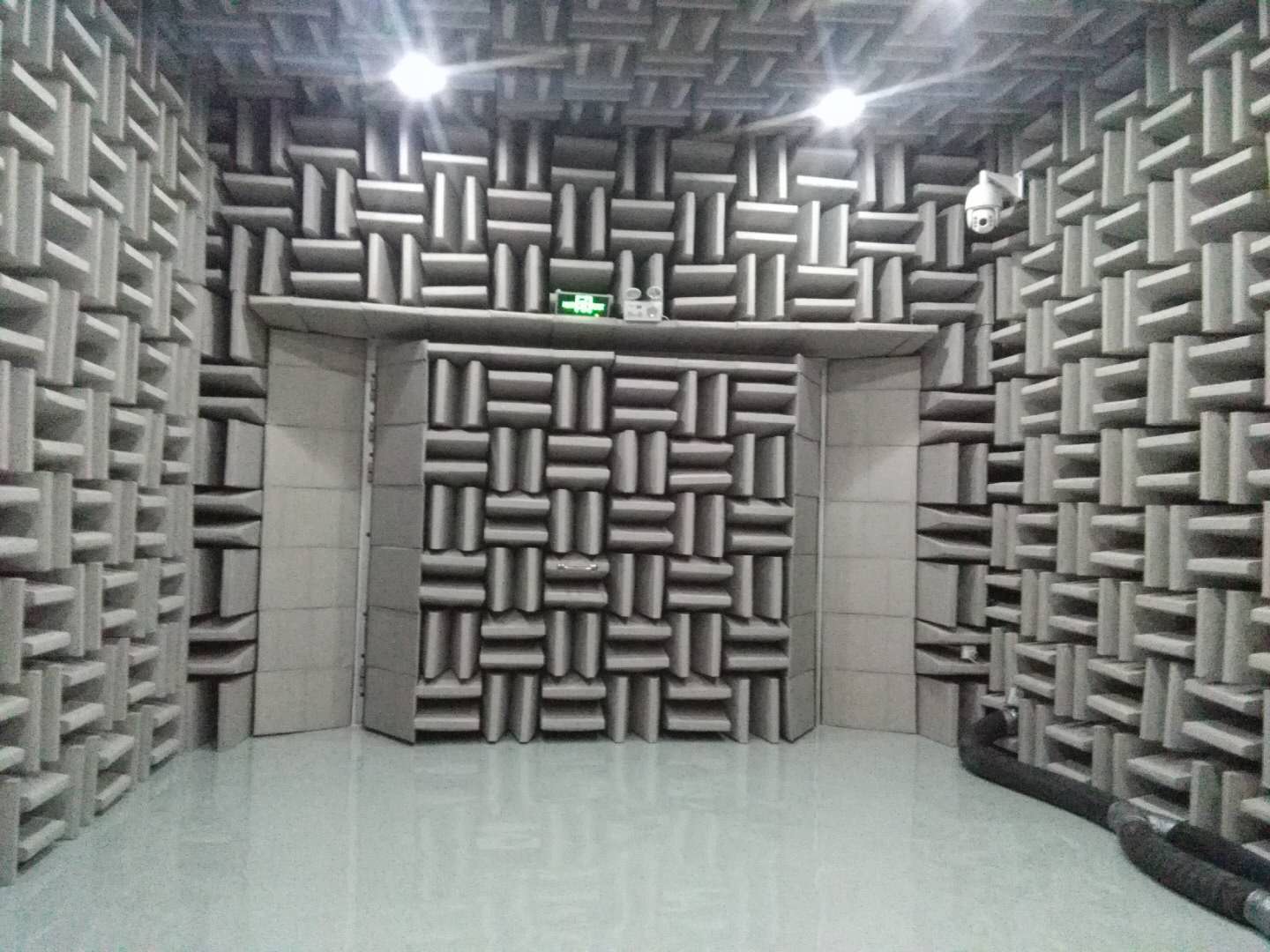 2)半消聲室安裝項目安裝專業無回聲無噪聲的照明燈具 8盞,6個二三插插座相應地延長至丹品吸音消聲尖劈的凹形內部適合使用處;